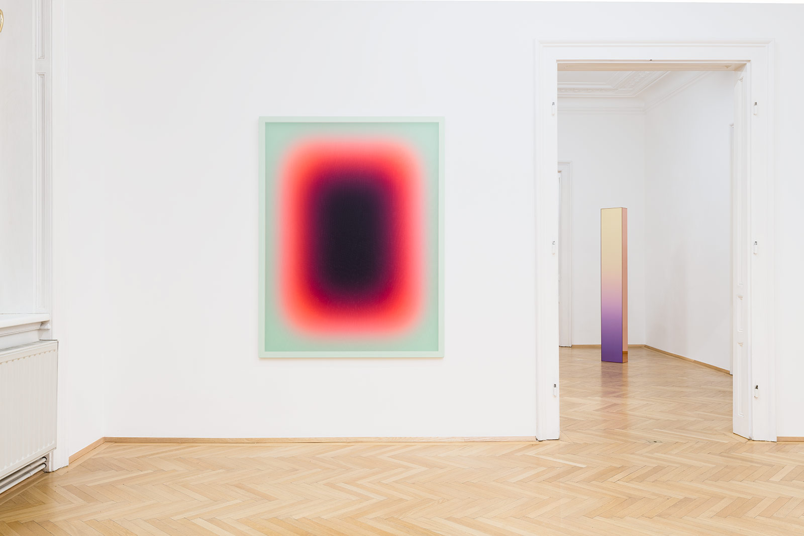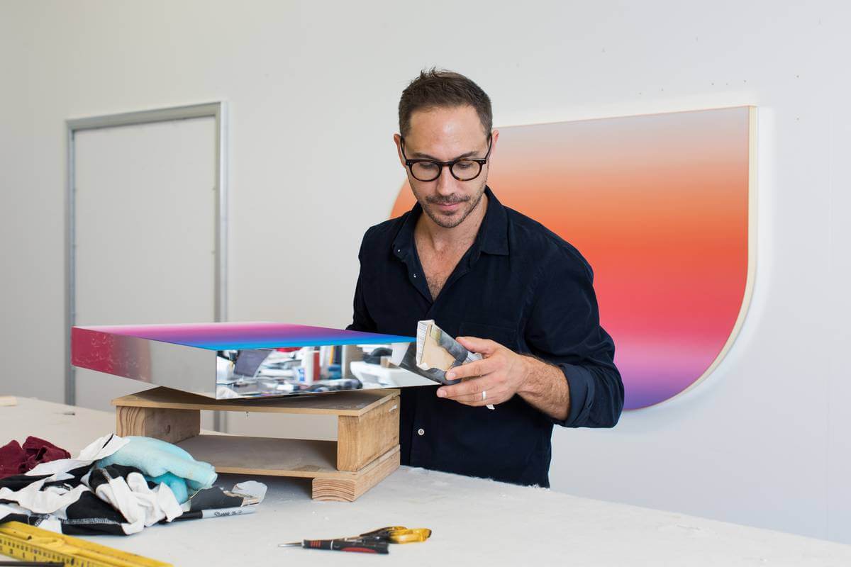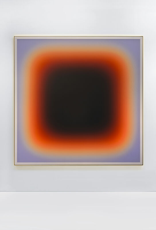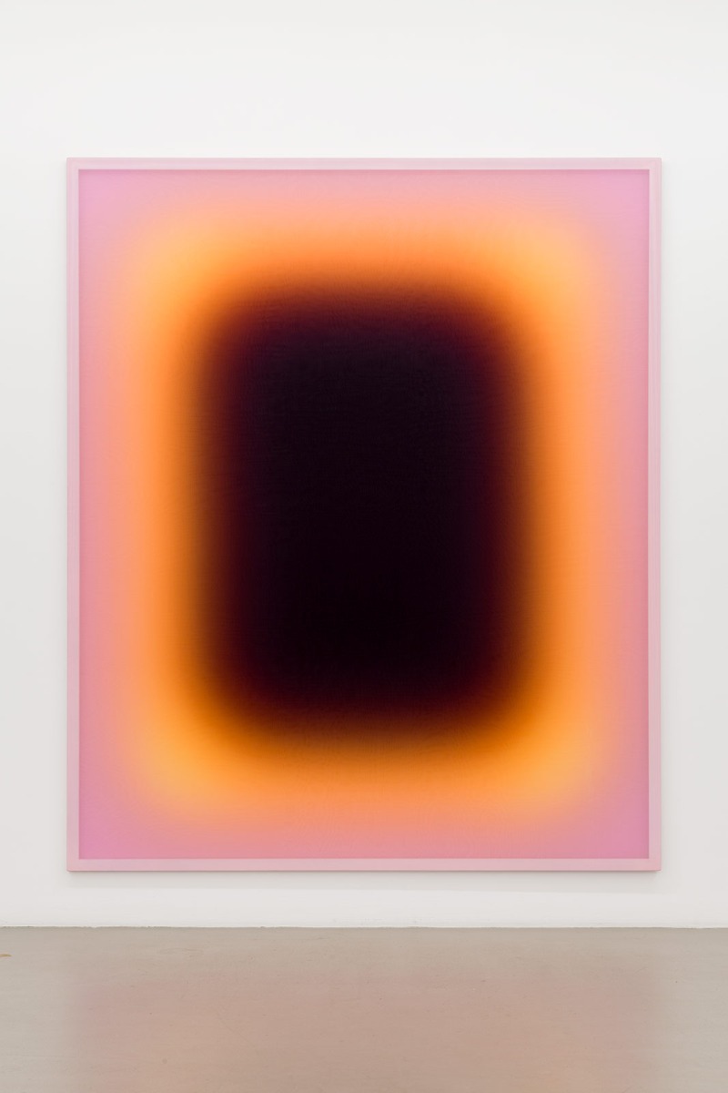 “Working across an expanded field of painting, sculpture, and abstraction, Jonny Niesche’s vividly colored work wraps the viewer in total sensory stimulation,” wrote Starkwhite, an art gallery in Auckland, New Zealand. “The seductive, iridescent surfaces of his paintings hum and shimmer with pigment, color that seems to float slightly above the voile surface. The effect is intensified by the indistinct edges between bands of color that surround the dark middle ground.”