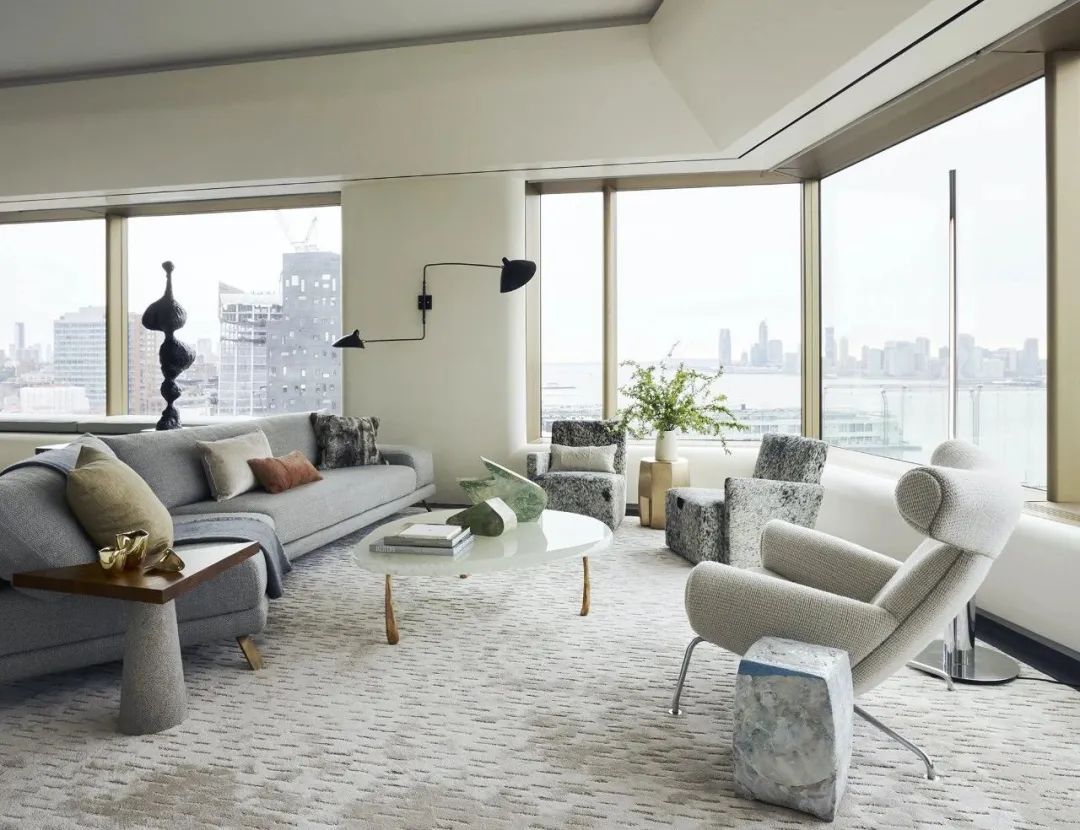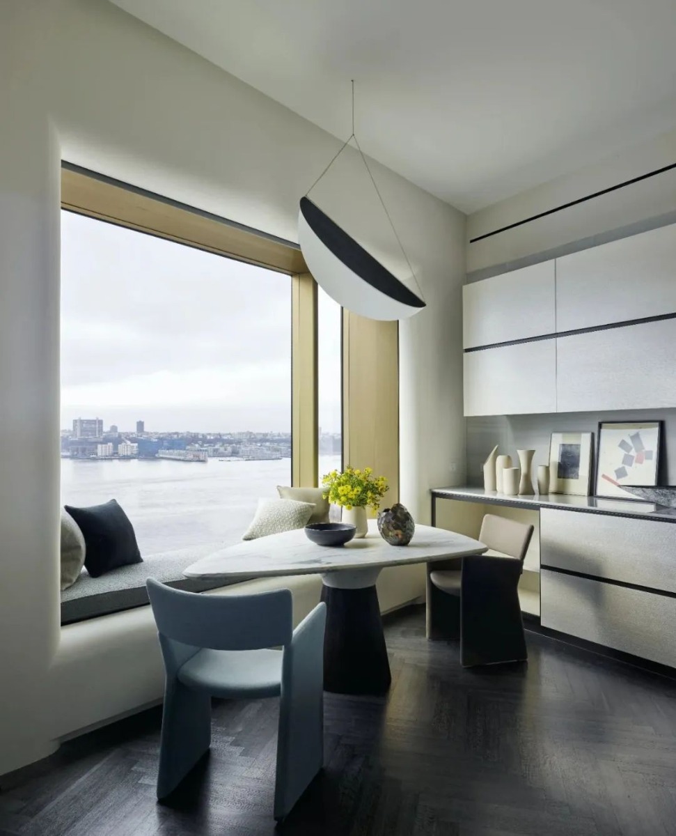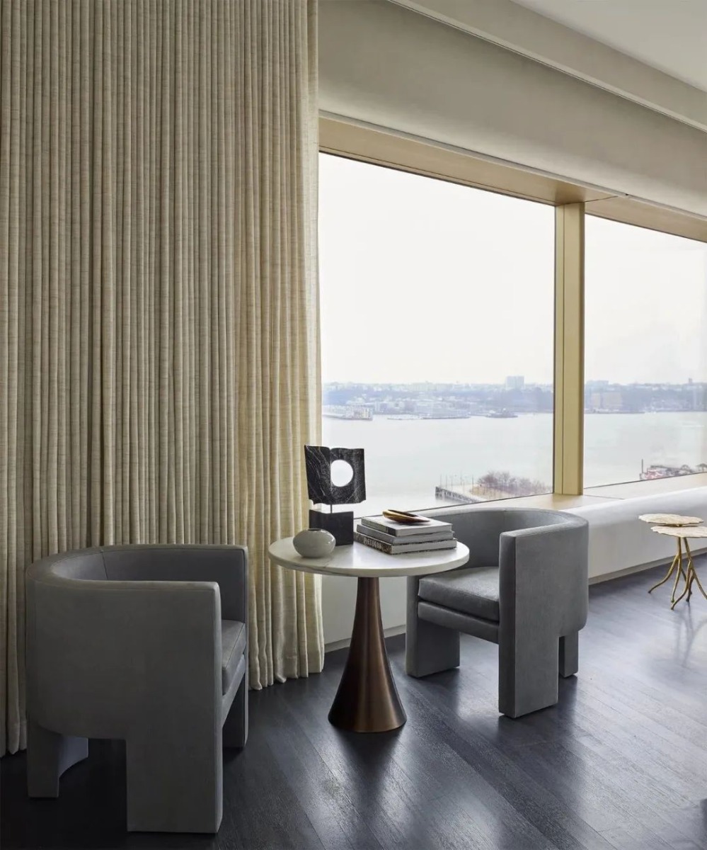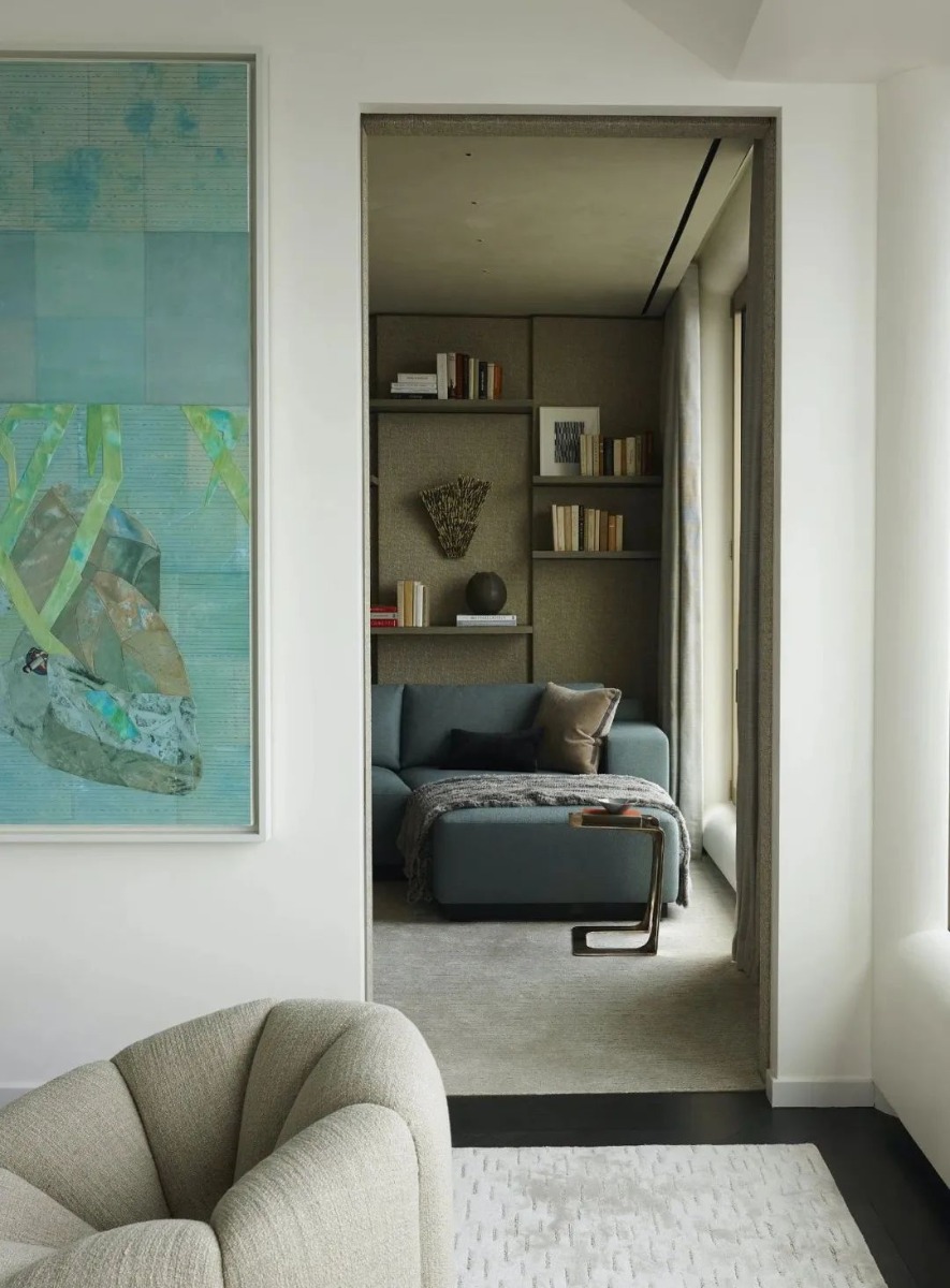 At 551 West 21st Street, GRADE created this 4,300 SF art-filled pied-à-terre and curated a collection of modern art specifically for the residence, skillfully weaving pieces into the interior design and renovation of spaces. Located on the edge of the Chelsea Arts District, inside the masterly designed residential building by Sir Norman Foster, GRADE echoes exterior architectural elements in the personalized details throughout the apartment interiors. Custom features are found in the library, dining room and gallery: upholstered wall panels, decorative display niches and a suspended, suede-wrapped canopy. Tapping into the neighborhood culture and essence, GRADE carefully selected furnishings, lighting and works of art from galleries and artists around the world to create an immersive, artful residential experience set to panoramic city views.