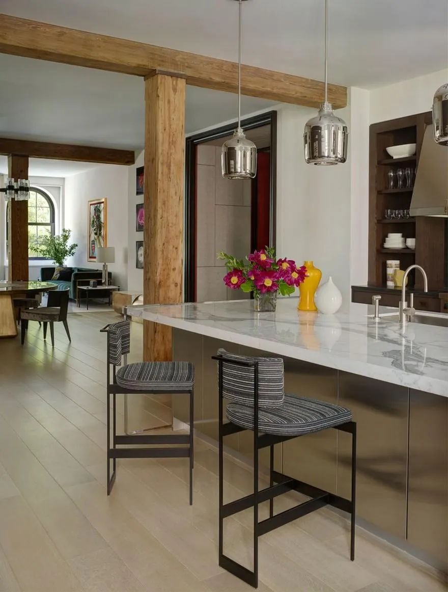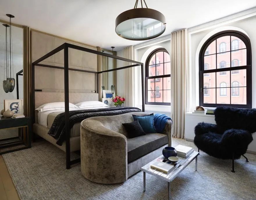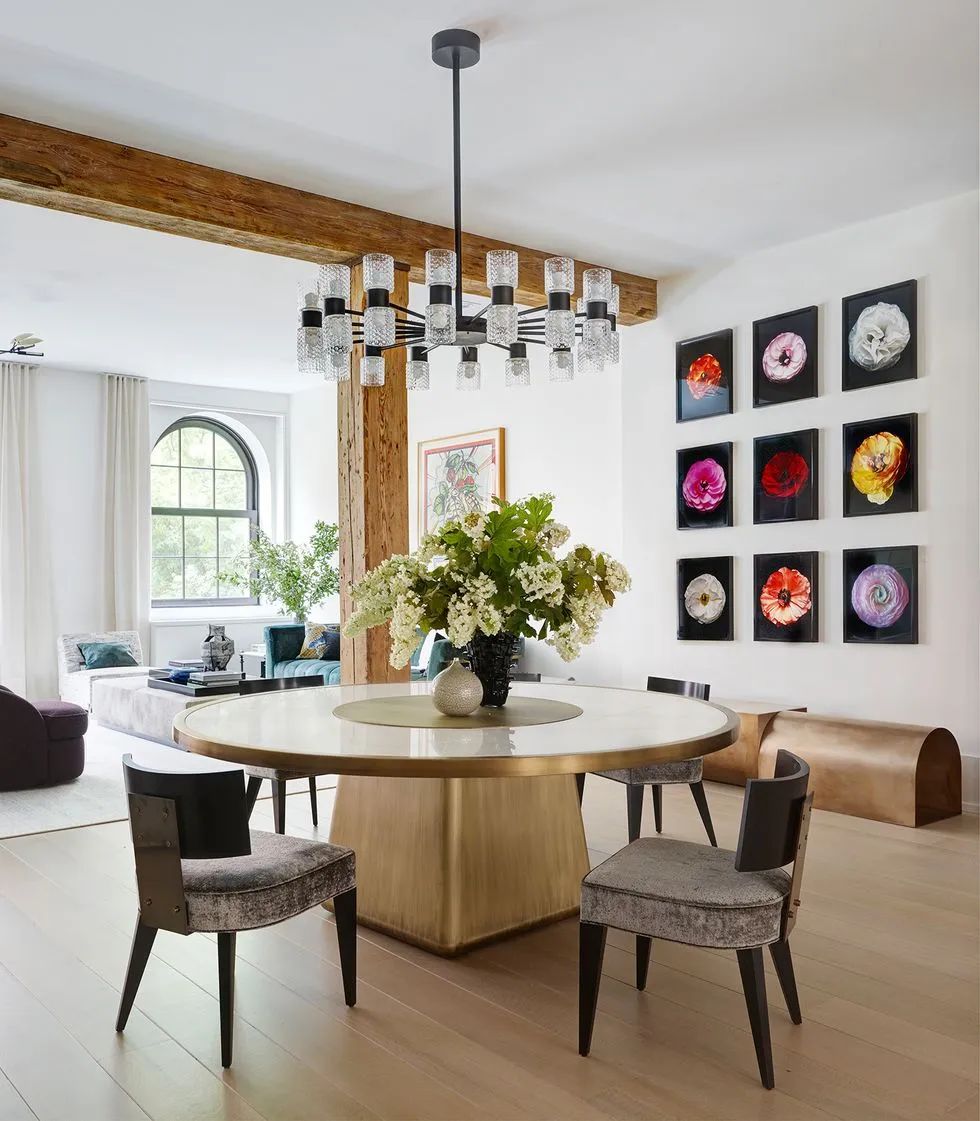 Featured in Architectural Digest, GRADE transformed a 3,400 SF white box loft into a bold, art-filled pied-à-terre through the use of modern art pieces, inspired detailing and finishes, and eclectic furnishings. GRADE aimed to soften the rigid architecture of the space and decorative wood beams using creative applications of color with a mix of softly curving, feminine forms and vibrant works of art. Intriguing accents in purple, red, and green in the open plan living areas create a dynamic environment and balance the masculine architecture with a modern aesthetic. Subtle homage is paid to the building’s industrial past with bespoke pieces, juxtaposing contemporary materials with classic patterns and textures and hinting at the evolution of the surrounding Tribeca neighborhood.