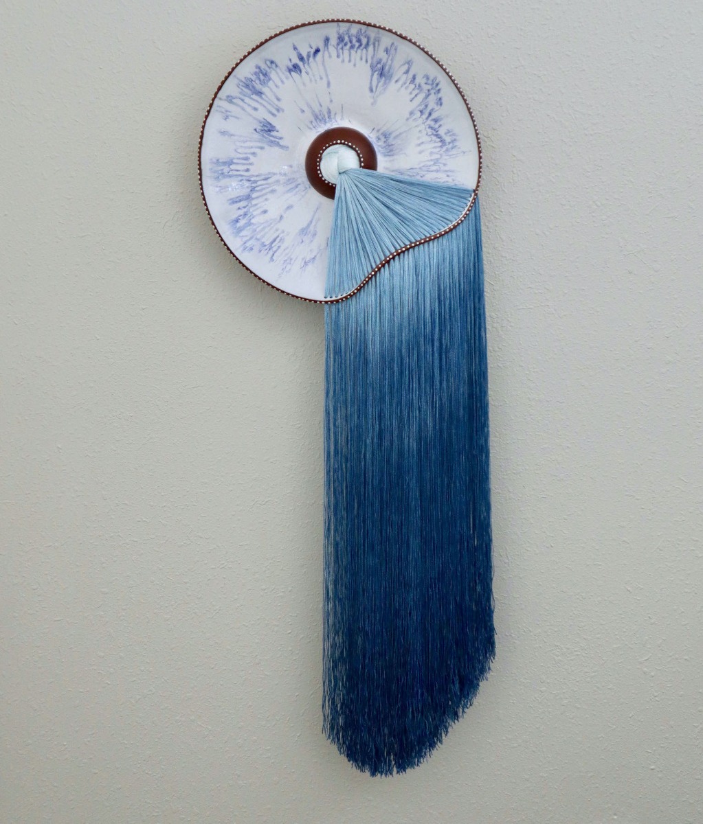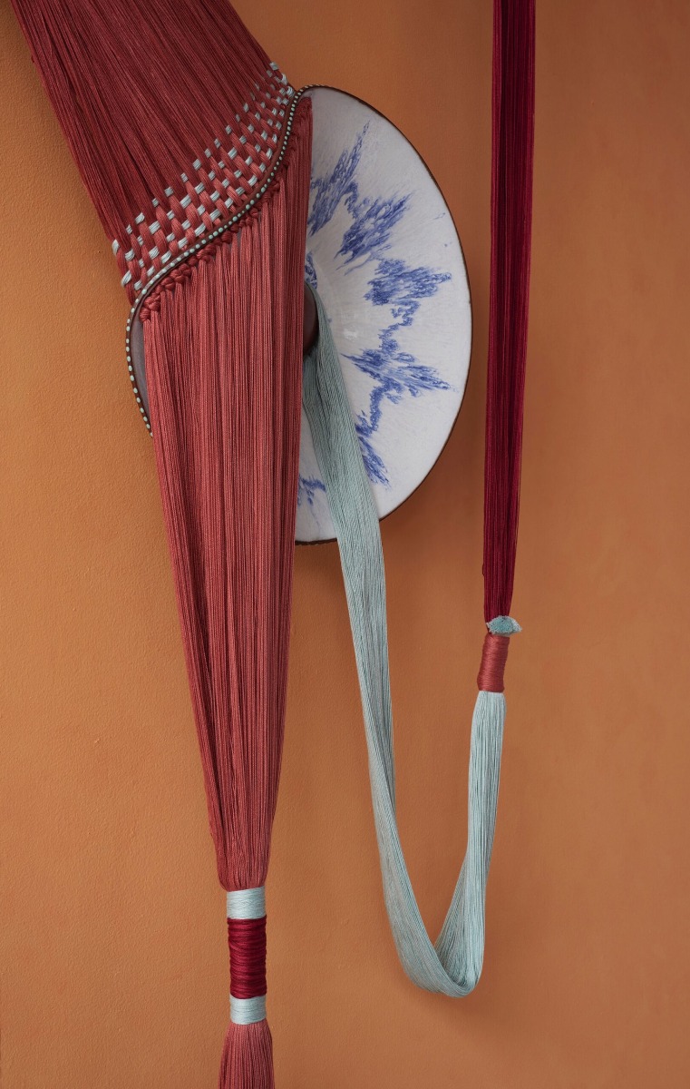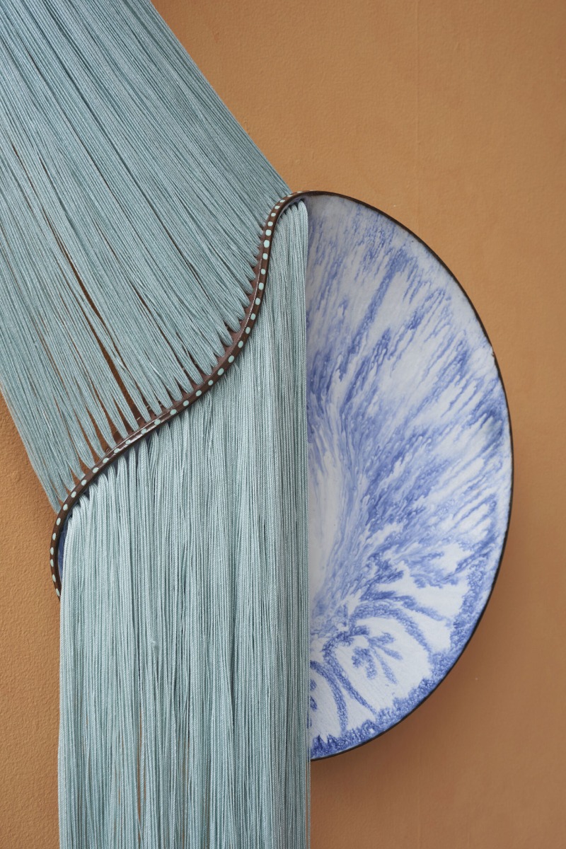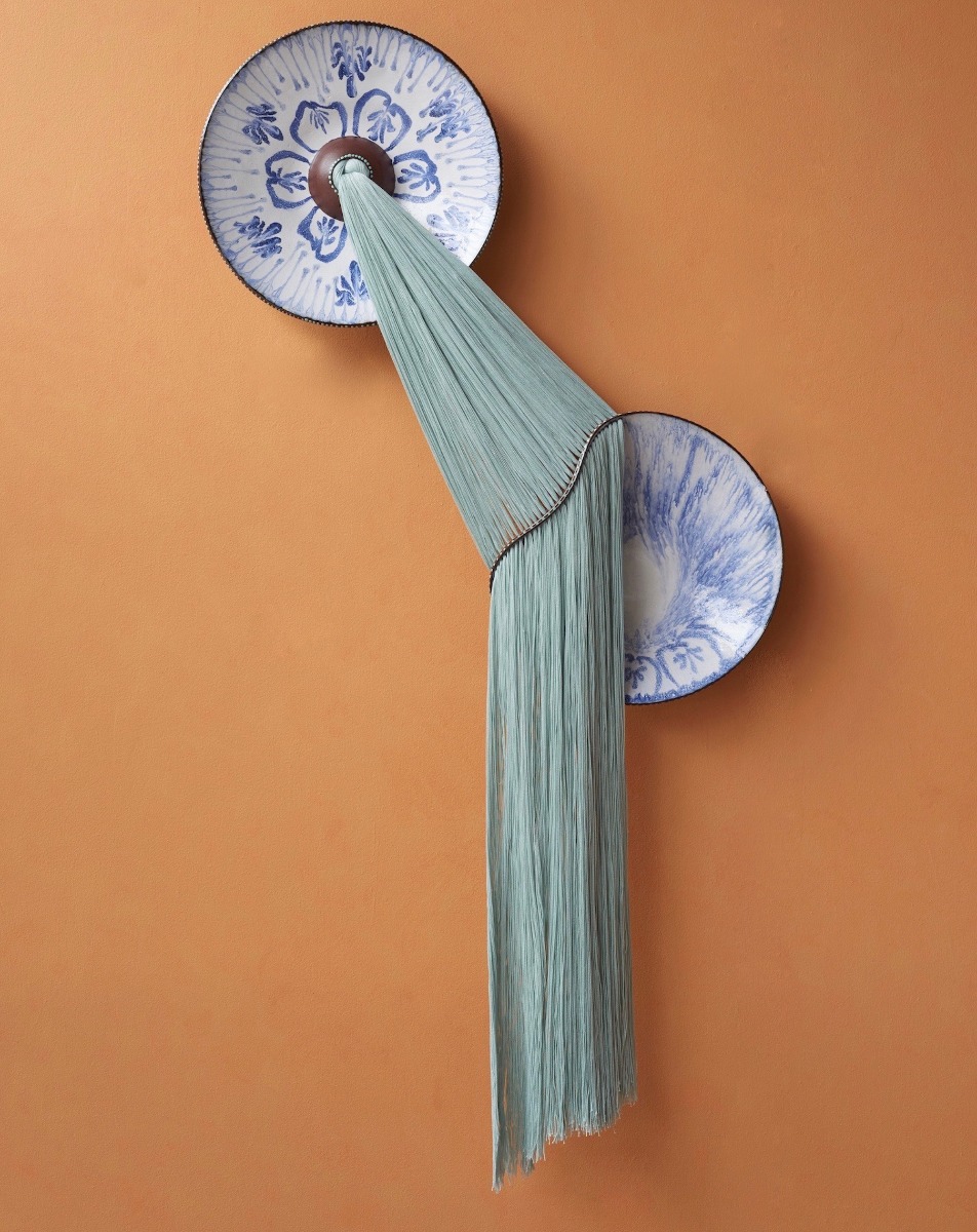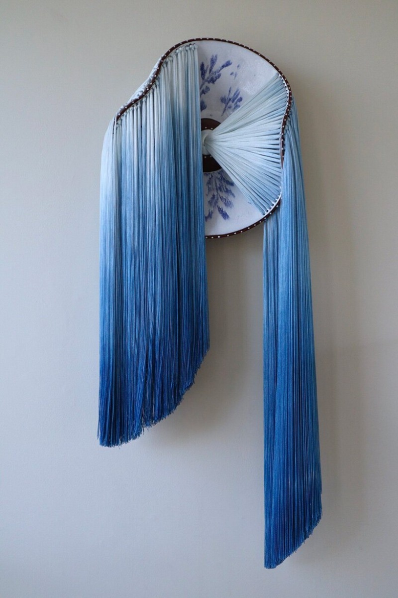 “In her mixed-media works, the artist contrasts the soft, pliable fibers with the fragility of the plates painted with blue-and-white motifs,” writes journalist Grace Ebert, who recently published a feature article on McLaughlin. “Dyed in subtle gradients and earth tones, the loose threats are woven through the sloping ceramic edges and knotted in the center.”