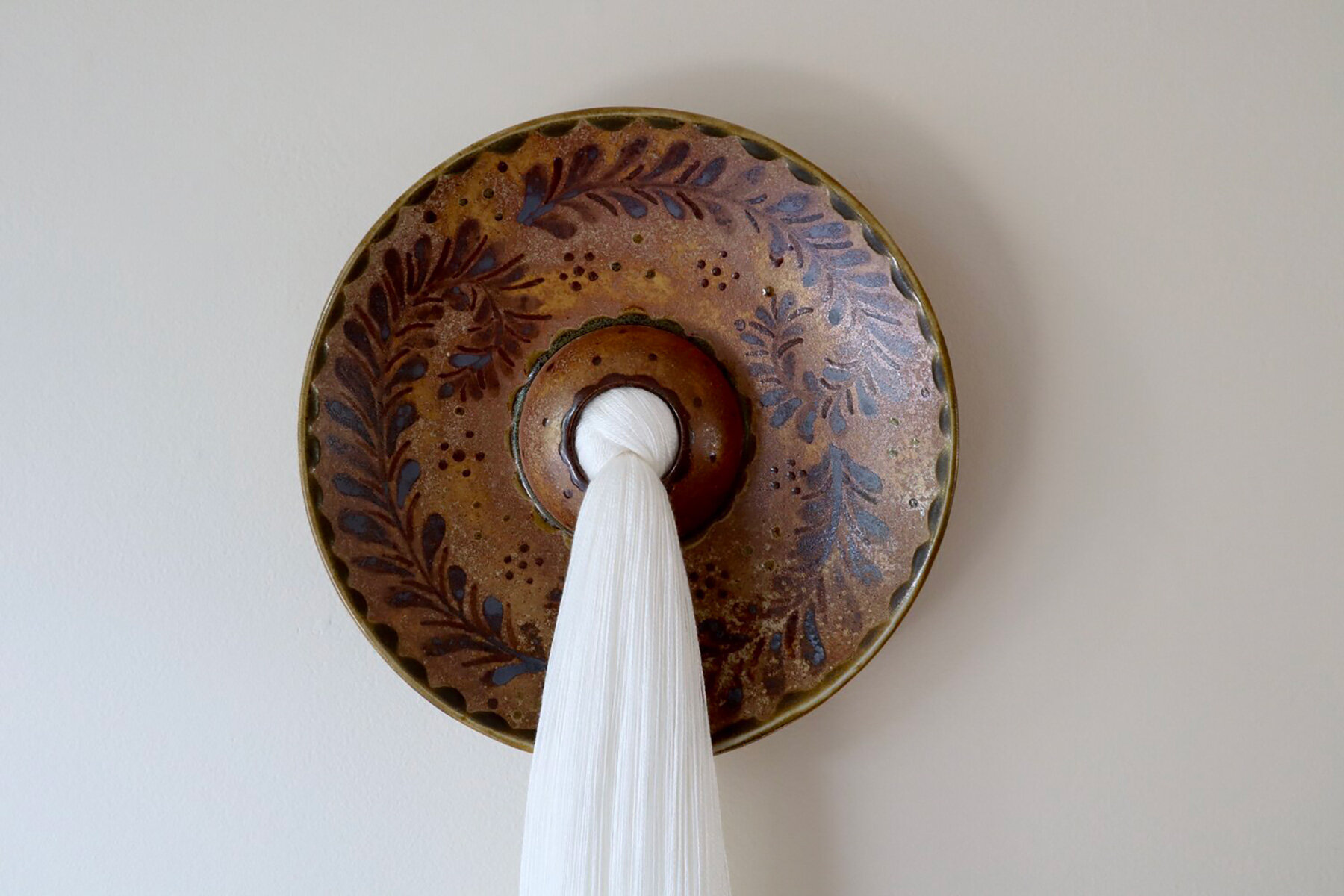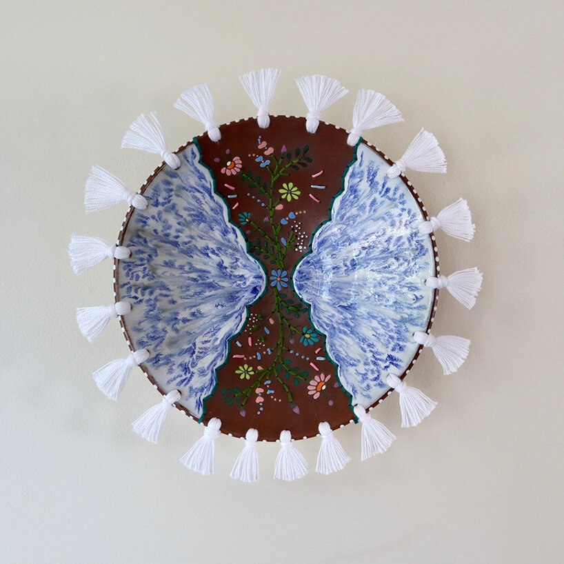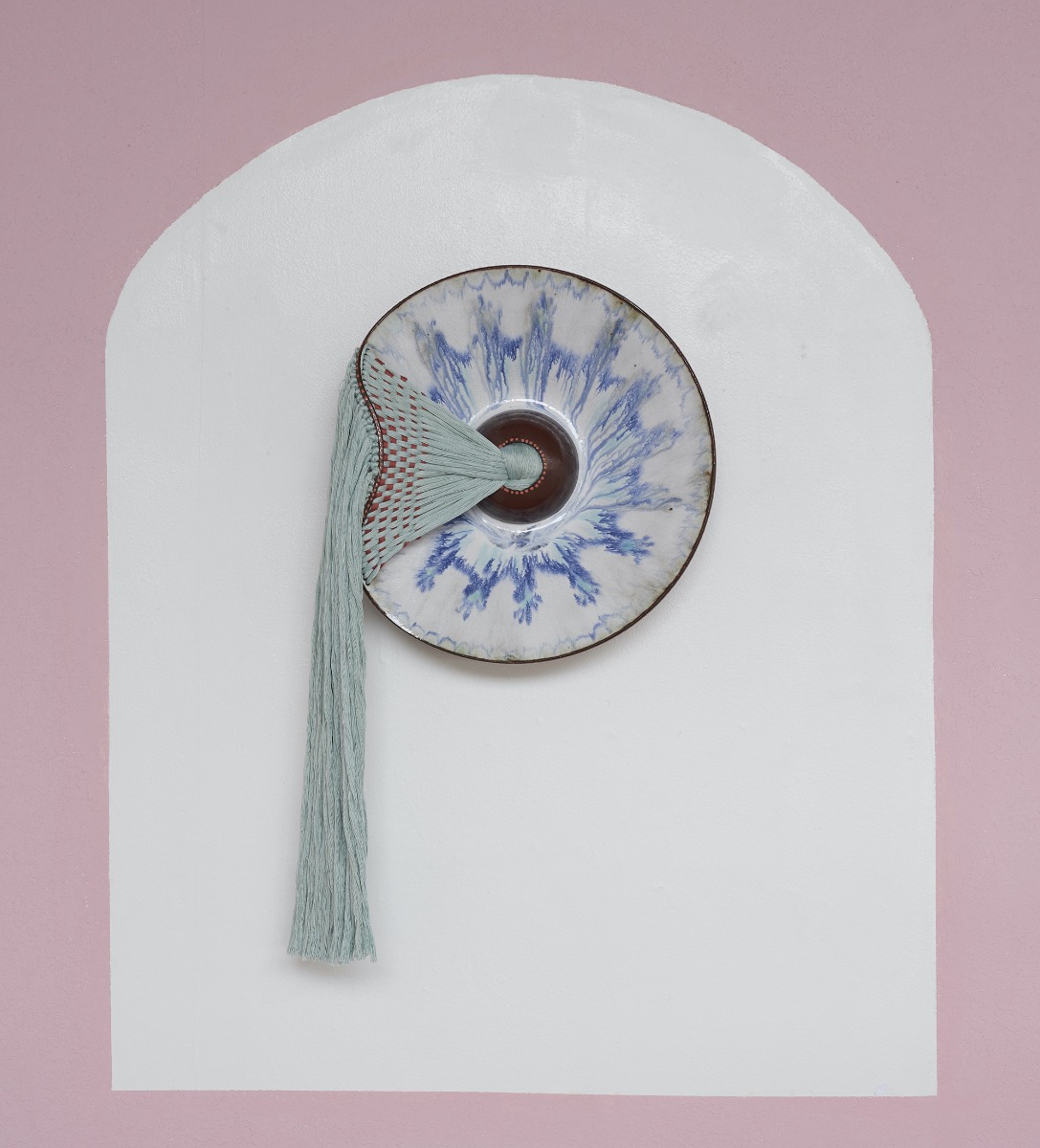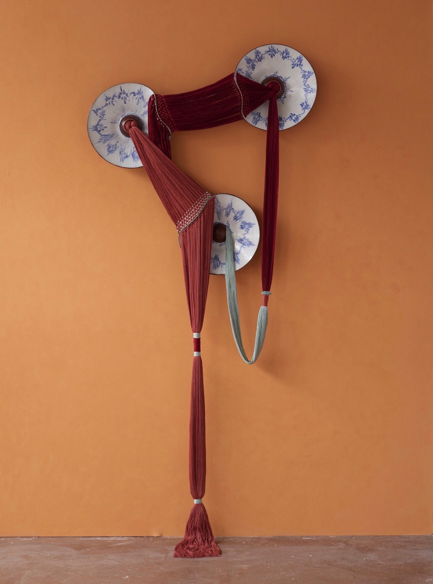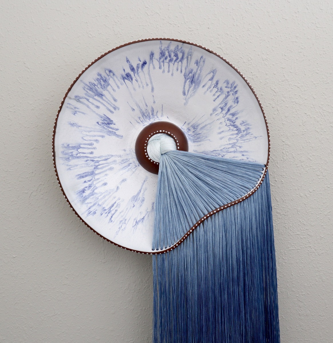 “In her mixed-media works, the artist contrasts the soft, pliable fibers with the fragility of the plates painted with blue-and-white motifs,” writes journalist Grace Ebert, who recently published a feature article on McLaughlin. “Dyed in subtle gradients and earth tones, the loose threats are woven through the sloping ceramic edges and knotted in the center.”