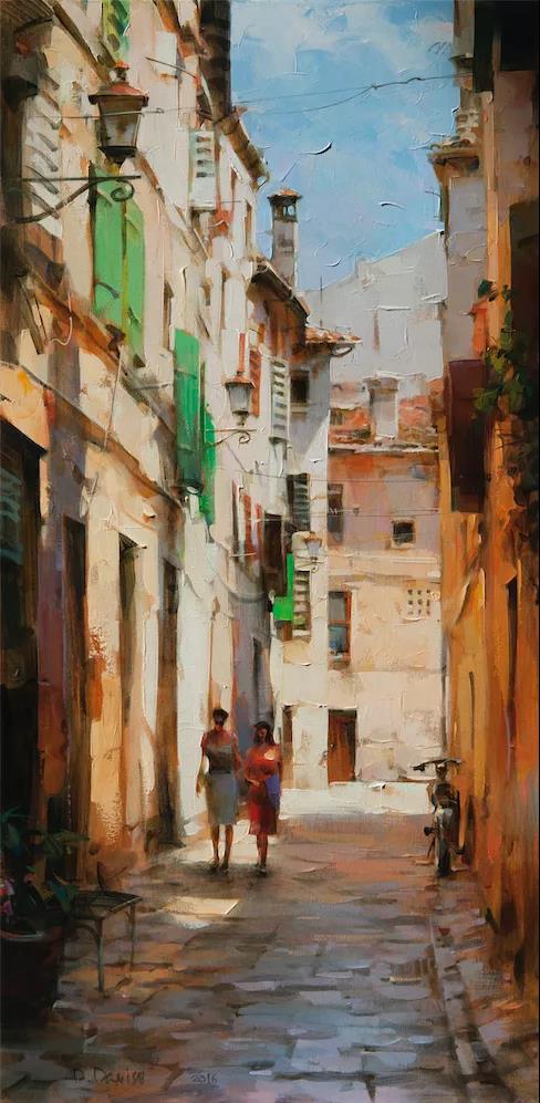 In college, Dmitri was fascinated by the city of Kharkiv, where he was born and grew up. He painted all kinds of buildings, wooden houses and walls, small cafes under huge old trees, and doors and windows of his southern city. His paintings depict Kharkiv as a warm and comfortable place to live.