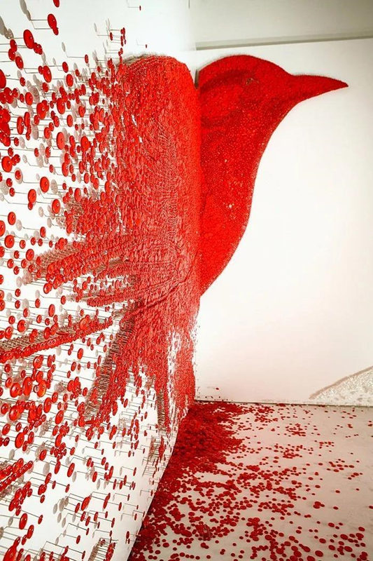 When creating, we need to go to the project site to shape by projection, and then fix the buttons on the wall one by one with nails. It's better to choose wooden board as the wall, so that we can use longer big nails, which is more delicate and textured. The difficulty lies in making the nail spacing dense and orderly, and the head of the bird has excessive color depth.