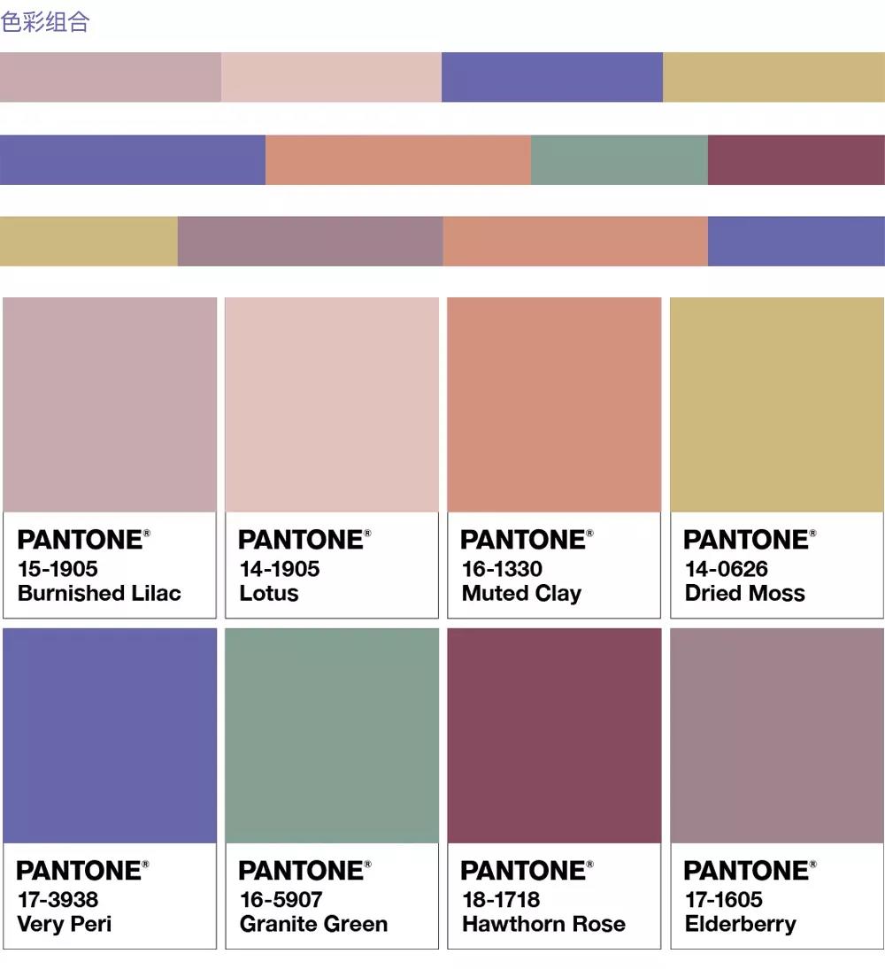 According to Pantone, Very Peri imbues dreamy purple and energy red with a serene blue tone, projecting a warm, cheerful and energetic attitude. Pantone has kindly come up with a color scheme for your reference.