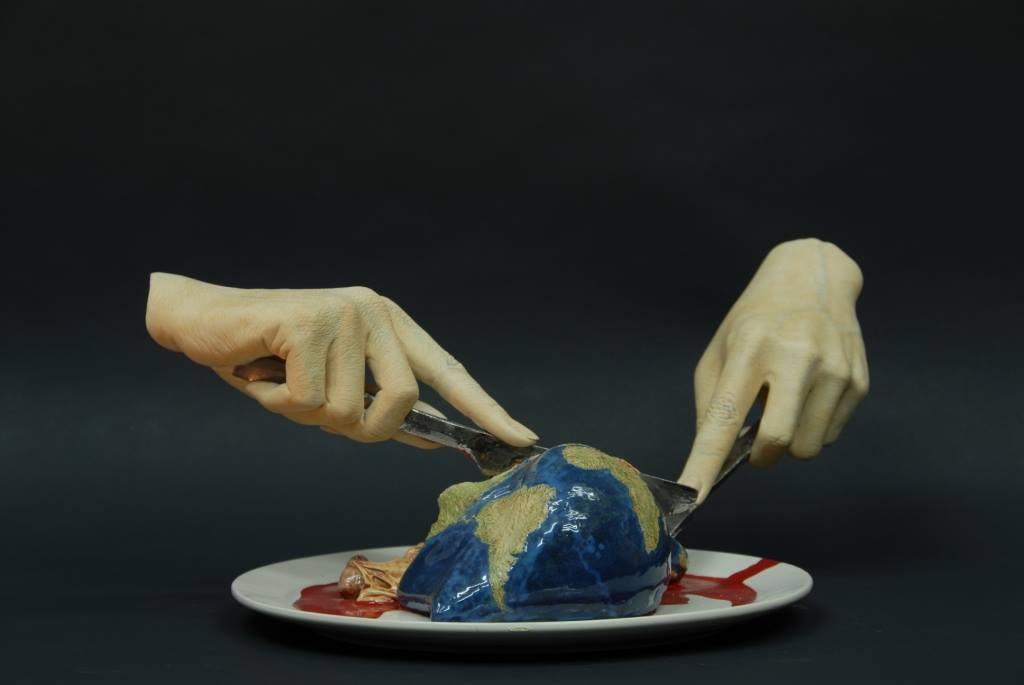 This work done in 2006 expresses the untold truth of society here on Earth. Two hands with a fork and knife in each hand digging into a dish you’ve never seen before. On the plate is a meal that looks like the Earth with a fetus inside.The tragic message is that humans are rapidly depleting our planet for our own good from each generation. Humans leave the next generation with a whole new set of issues to deal with instead of setting them up for success. It’s tragic, yet a genius perspective to the future made in a dish.