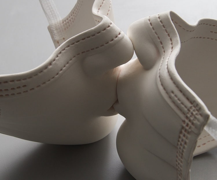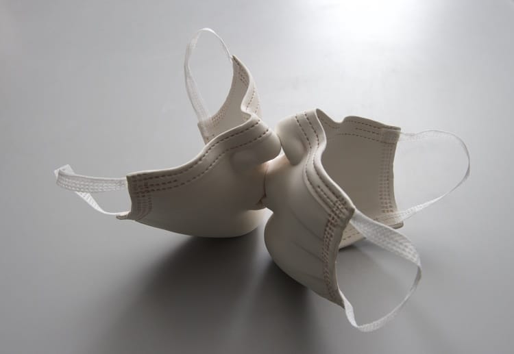 This piece is a perfect expression of how Tsang reflects on the obstacles of society. A symbol for the COVID-19 pandemic has been the masks that billions of people use today to prevent spreading. Tsang created a delicate sculpture where two masks are shaped into faces. The intertwined face masks are locked in a kiss with noses and lips that look like humans.