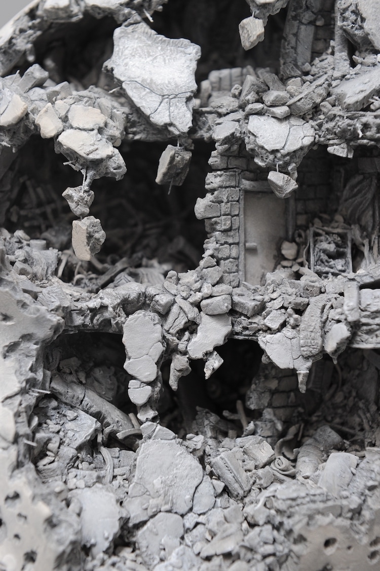 Here and There, for example, features a human face with the eyes closed in a resting expression. Half of the face is human, while the other half appears as a crumbling building. The face is three-dimensional with gaping holes and debris. It looks like the building is going through major demolition. Just as people appear to be in peace, they may be torn down on the inside with nobody knowing.