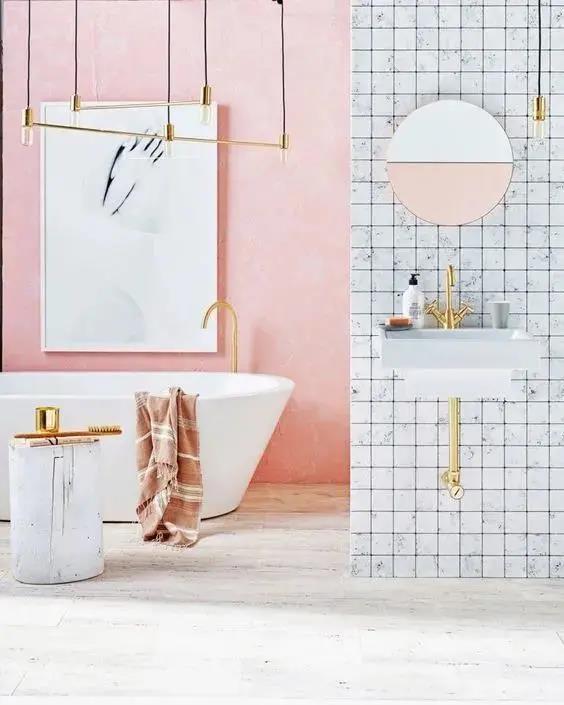 In a bathroom, the white decorative paintings blend well into the pink walls.