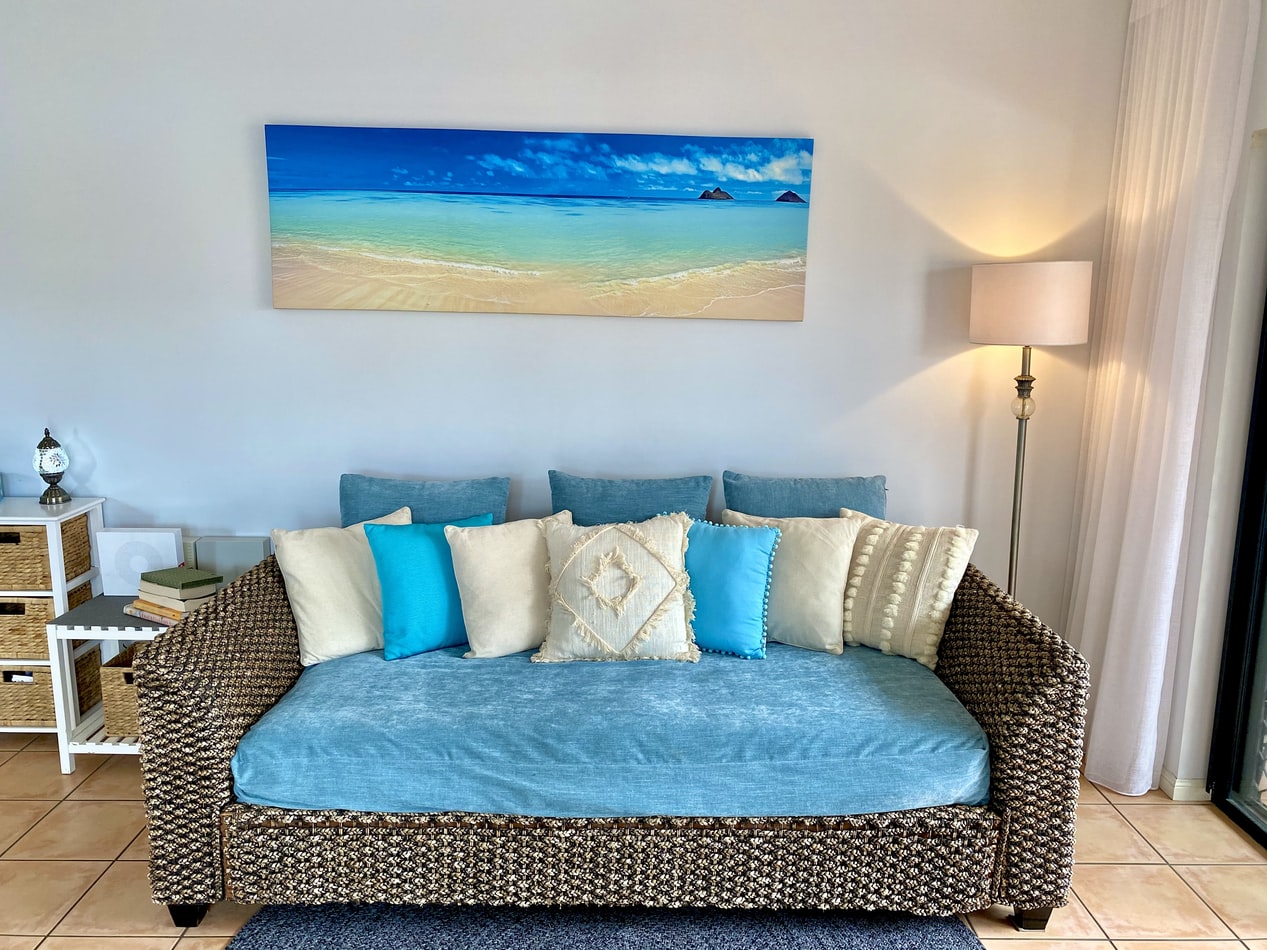 The blue pillows are bright, but the beige colors in pillows and decorative paintings are very light. As soon as the fresh and soft aqua beige appears, with one thicker and one lighter, gaudy colors are immediately lowered, and the entire space is balanced.