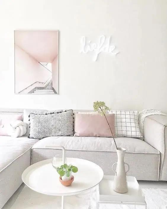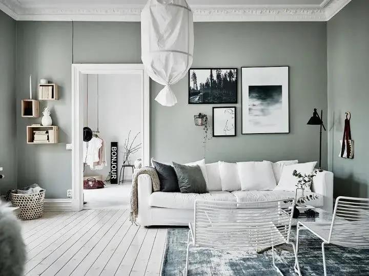 The walls, framed paintings, pillows, and carpets all maintain the same color system. The framed arts can choose some black and white or dark green so that the overall atmosphere can be fresh and peaceful.