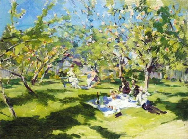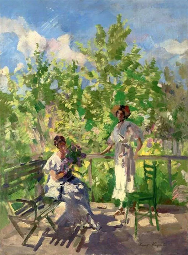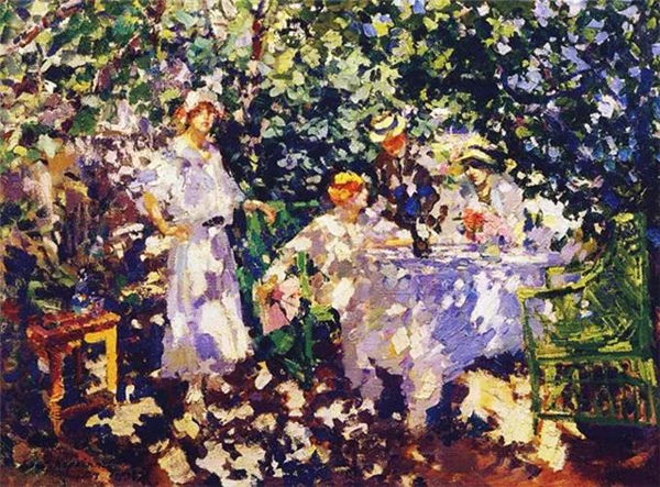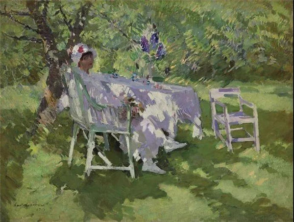 Korovin further experimented with the interaction between color and light of a white lady sitting in a garden. The central figure dressed in white lights up the composition and inspires the apple green hue on the surrounding trees and lawns. The white on the tablecloth and the contrast texture in the leaves of the trees cleverly use to further enhance the effect. These abbreviations can also be seen in Corwin's "terrace" in 1916, in which Corwin used similar elements to create the brilliance of natural sunlight.