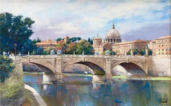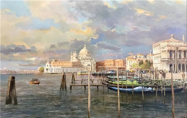 In the late 1990s and early 2000s, Madgwick traveled to Italy, where he painted the landscapes and architecture of Venice and Florence. He was a member of the Royal Society of British Painters and often exhibited in his hometown, England, until his death in Suffolk, England in 2005. McGwick’s oil paintings are in the collection of Queen Elizabeth II of Windsor Castle.